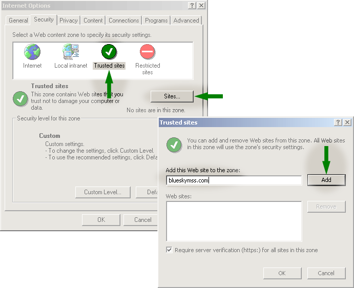 Under the Security tab, select Trusted sites, click Sites button, type blueskymss.com and click Add button :